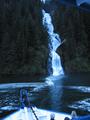 After dinner, as we were cruising south along Chatham Strait, Sean suggested that we should all head out onto the decks to enjoy the scenery. We turned, passing through a narrow channel into Red Bluff Bay. It was all very quiet and peaceful as we approached a waterfall cascading down the steep slope on the port side. Captain Jim Nowlin, having spent the past couple of days manoeuvering to ensure that we got great views of the scenery and wildlife, had obviously decided it was time to enjoy himself. He turned the ship toward the waterfall and crept closer. Knowing that ships and rocks don't mix, we all expect him to stop before getting too close ...