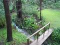 The fifth photo shows the water has broken the bank of the creek above the smaller waterfall near our house and is flowing around the plants on the far bank (to the left of the bridge). There's also a lot of water flowing over the grass on the far side of the bridge. Some of that is from the creek and the rest is runoff from above.